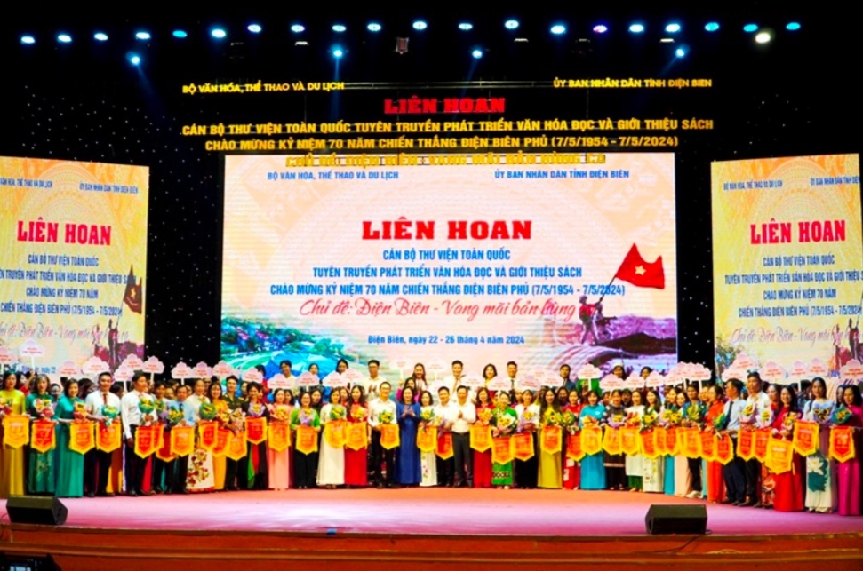 Tối 23/4, tại Trung tâm Hội nghị Văn hóa tỉnh Điện Biên, Bộ Văn hóa, Thể thao và Du lịch phối hợp với Ủy ban nhân dân tỉnh Điện Biên tổ chức Lễ Khai mạc Liên hoan Cán bộ thư viện toàn quốc tuyên truyền phát triển văn hóa đọc và giới thiệu sách Chào mừng Kỷ niệm 70 năm chiến thắng Điện Biên Phủ (7/5/1954-7/5/2024) với Chủ đề "Điện Biên - Vang mãi bản hùng ca".